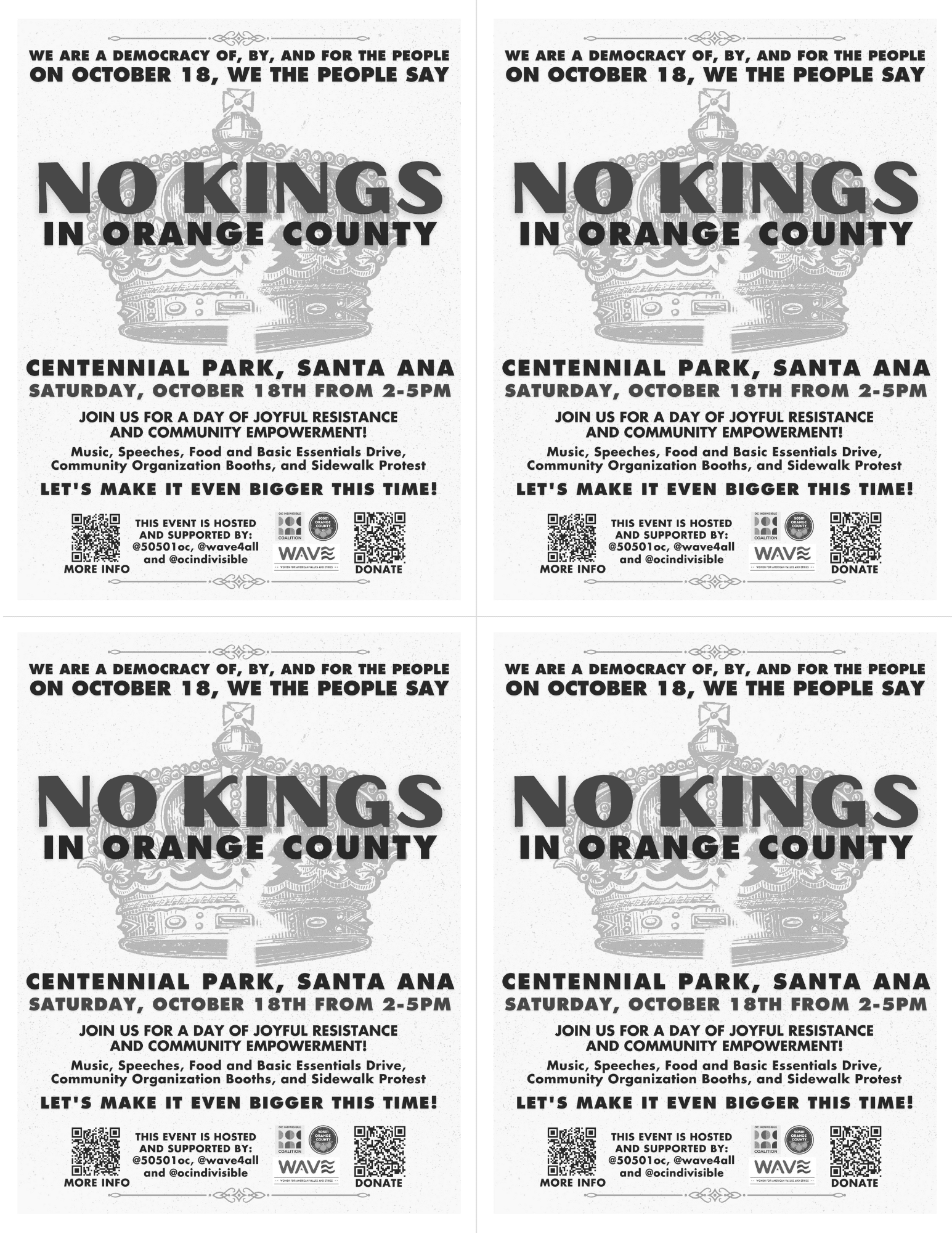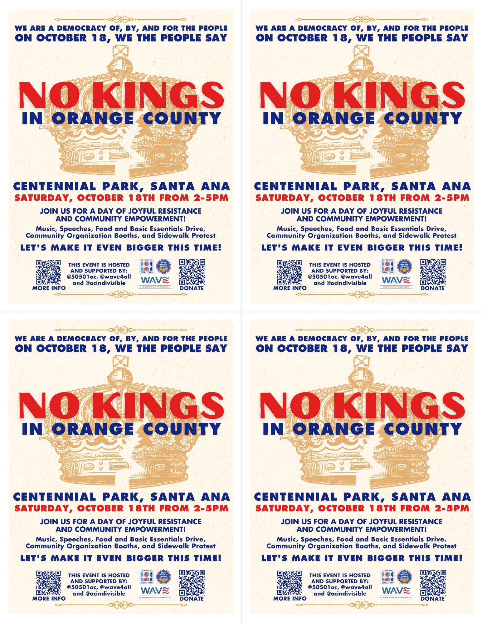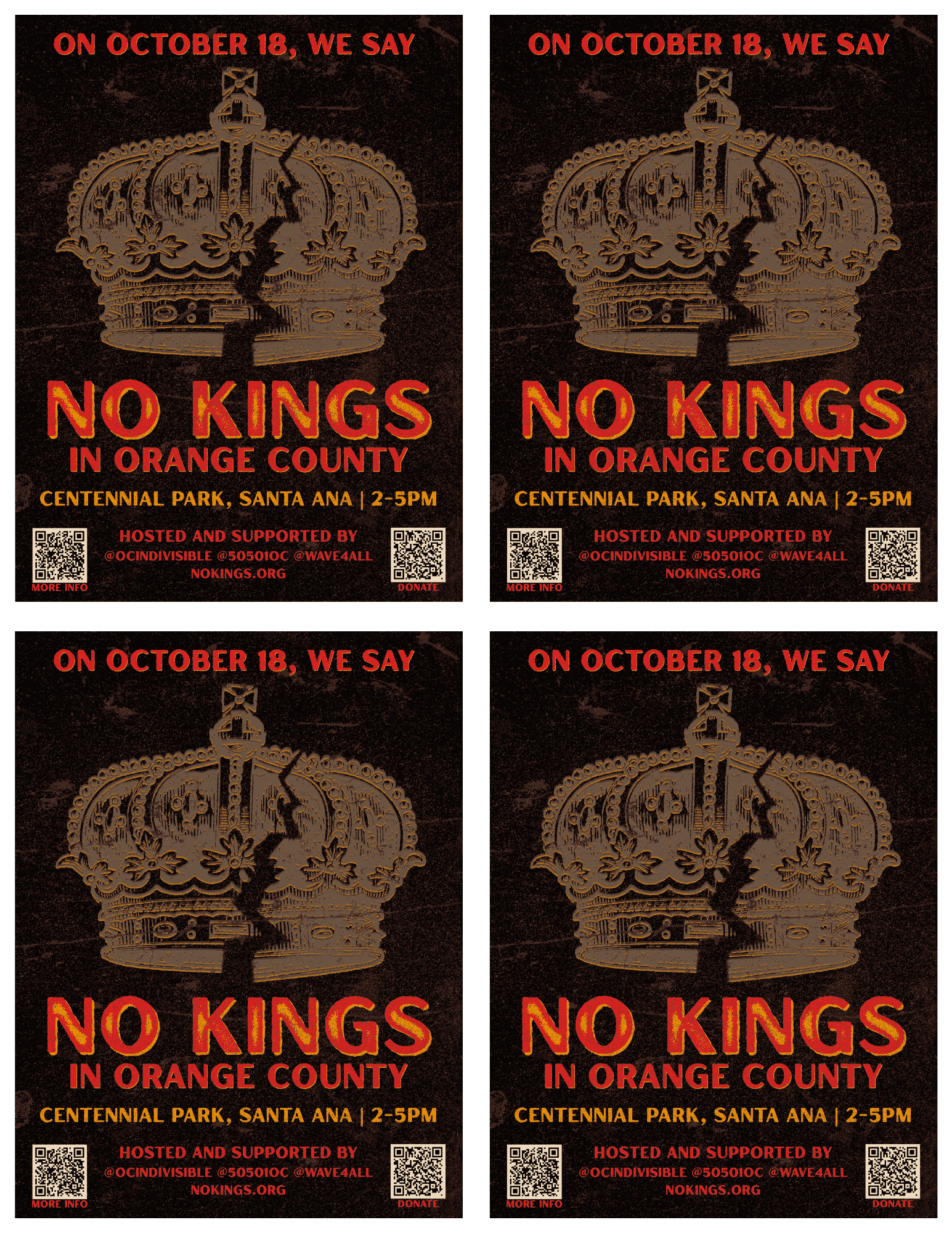 Interested in an easy way to help out? Have a printer at home? Print out some No Kings Orange County flyers and get out into your neighborhood to help us advertise the protest!